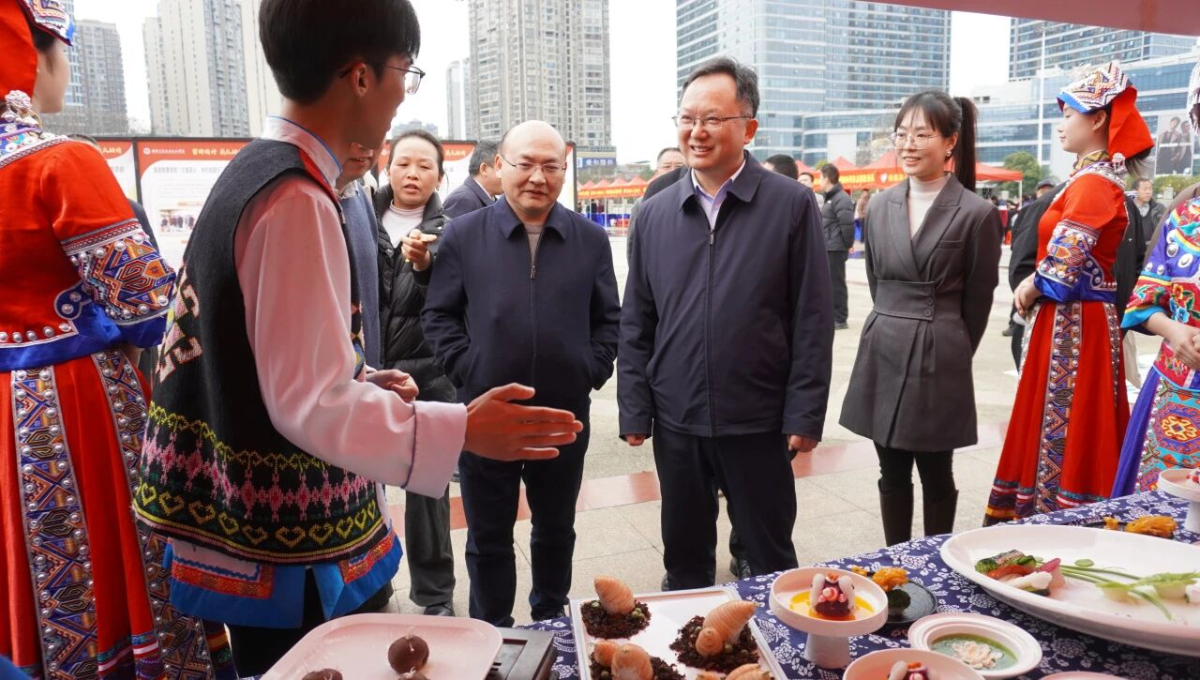 我校积极组织师生志愿服务队参与活动,充分展示办学特色与育人成果,彰显新时代青年志愿者的责任担当与青春风采。在启动仪式现场展示区,我校机电工程学院、民族艺术学院、旅游管理学院、经济贸易学院、信息与智能学院、交通工程学院、公共课部精心布展,通过图文展板、实物展示、互动体验等多种形式,生动呈现学校在社区服务、非遗传承、乡村振兴、技能助农、普通话推广等领域的志愿服务成果。州委常委、州委政法委书记彭延敏,学校党委书记谢绍猛,州委宣传部常务副部长谭必四,学校党委副书记、副校长陈杨晖等领导一行来到我校展台参观,与师生进行交流。