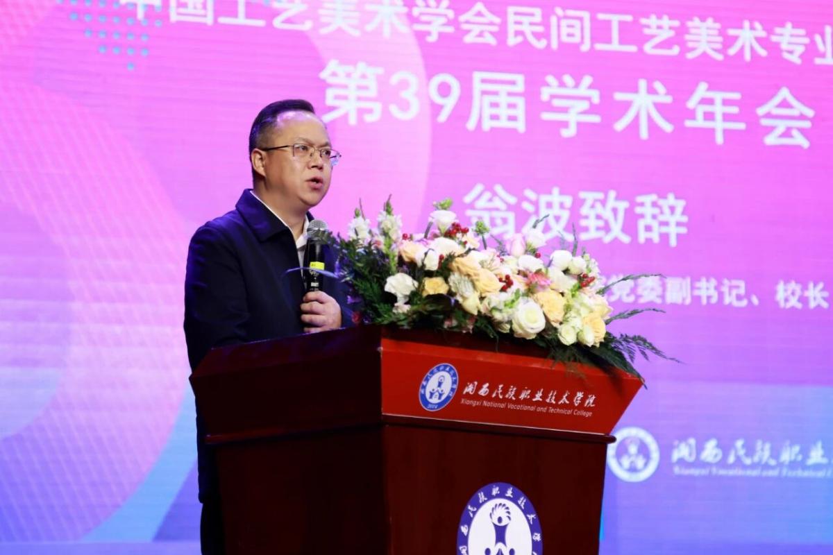 作为承办单位代表,翁波在欢迎辞中表示,湘西职院始终高度重视民族文化的传承与创新,坚持将非遗保护融入职业教育体系,致力于培养兼具文化自信与精湛技艺的高素质人才。他系统介绍了学校在民族工艺教育方面的实践成果,包括建成10个非遗大师工作室、打造“非遗工匠培育的湘西模式”、建设民族工艺与文化旅游省级一流特色专业群等,充分展现了学校在服务地方文化生态建设与乡村振兴中的积极作为。