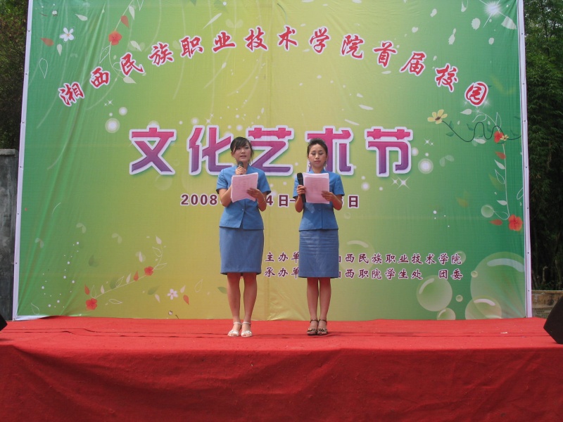 6月4日晚,由院学生处、团委联合承办的湘西职院首届文化艺术节开幕式暨夏之韵·舞蹈大赛在南校区隆重举行。院长李光寒、党委副书记副院长龚光耀、副院长李成斌、副院长段世强、副院长宋清华、工会主席阳兴开、州委直属工委李冬梅书记、州教育局余清海副局长、团州委石利民副书记及学院相关处室及系部负责人与4千余名师生共同观看了演出。开幕式上,院党委副书记、副院长龚光耀同志做重要讲话,他在总结了我院文化艺术节成绩时,强调我们要将本届文化艺术节的重心放在"繁荣校园文化,创造博雅文明校园环境,培养学生高尚情操"方面,要在继承和发扬我院校园文化主题鲜明、内容丰富的优良传统基础上,紧跟时代的步伐,弘扬奥运精神,营造良好的校园文化氛围。随后,院长李光寒宣布学院首届文化艺术节开幕式暨夏之韵·舞蹈大赛正式开始。