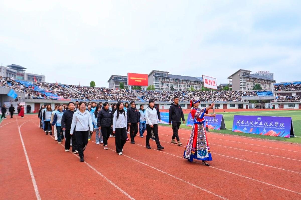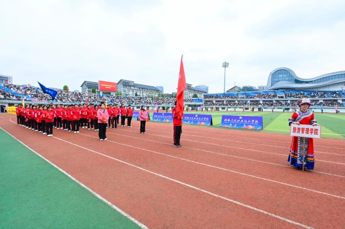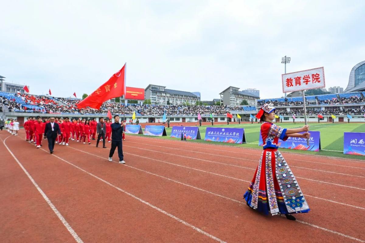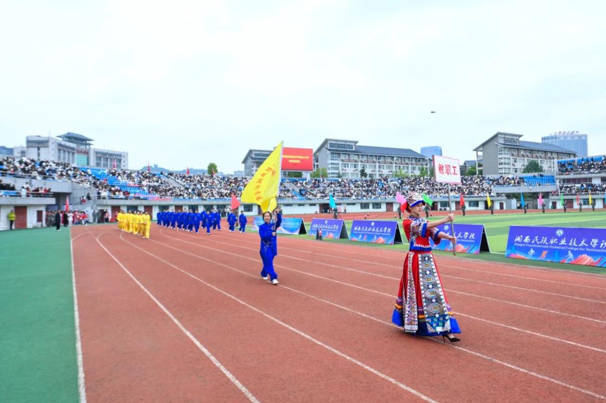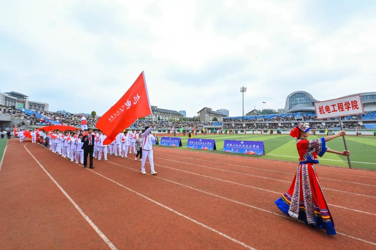 开幕式在公共课部、机电工程学院等联合呈献的舞龙舞狮表演中拉开帷幕。本次表演在传统舞龙舞狮的基础上,创新融入了湘西本土“钢火烧龙”等民俗元素,展现了中华民族传统文化中的湘西元素,赢得全场阵阵喝彩。国旗护卫队步伐整齐、神情坚定,护卫五星红旗庄严入场,学校纠察队组成的彩旗方阵与裁判员代表队紧随其后步入会场。八个二级学院结合各自专业特色,以富有创意的入场形式和精彩表演,将现场气氛推向高潮,充分展现出各学院的蓬勃朝气与育人成果。教职工代表队带来的太极表演,则生动诠释了师生全民健身、终身运动的良好风尚。