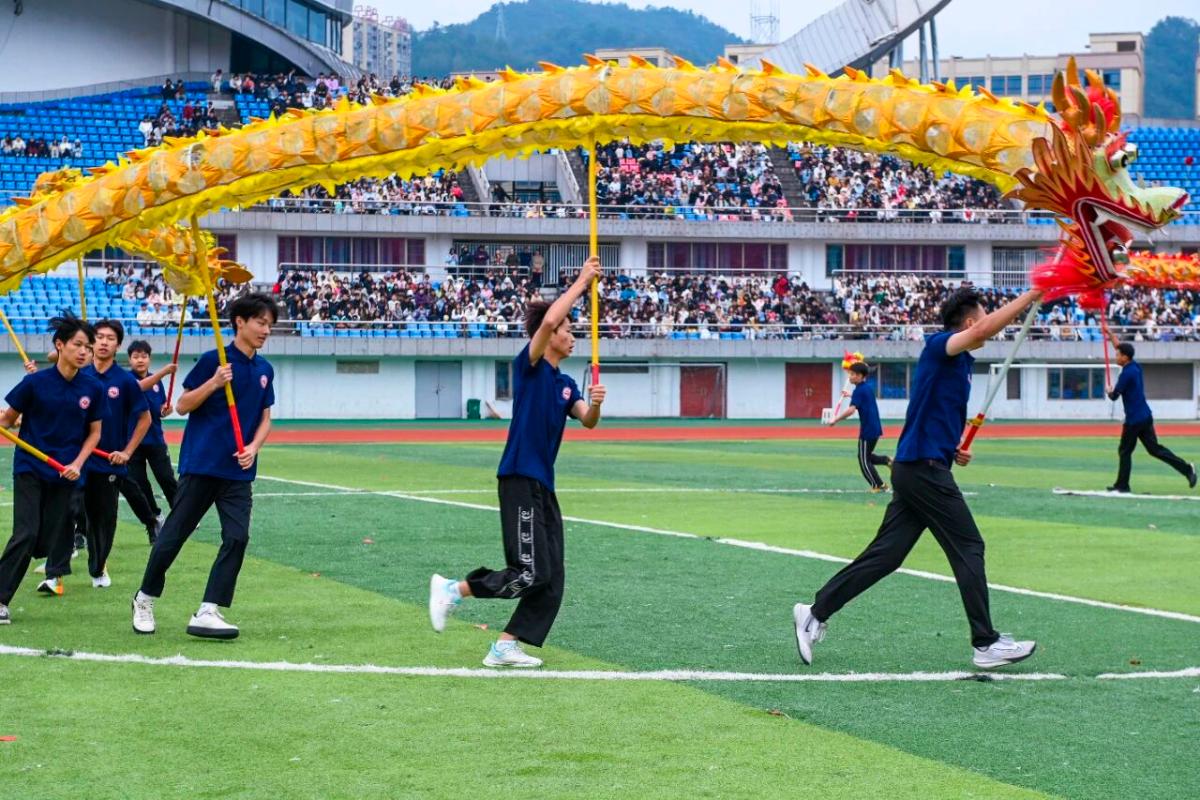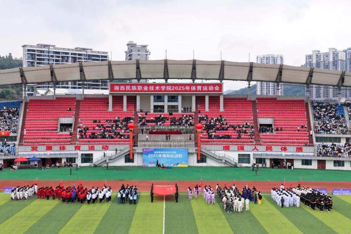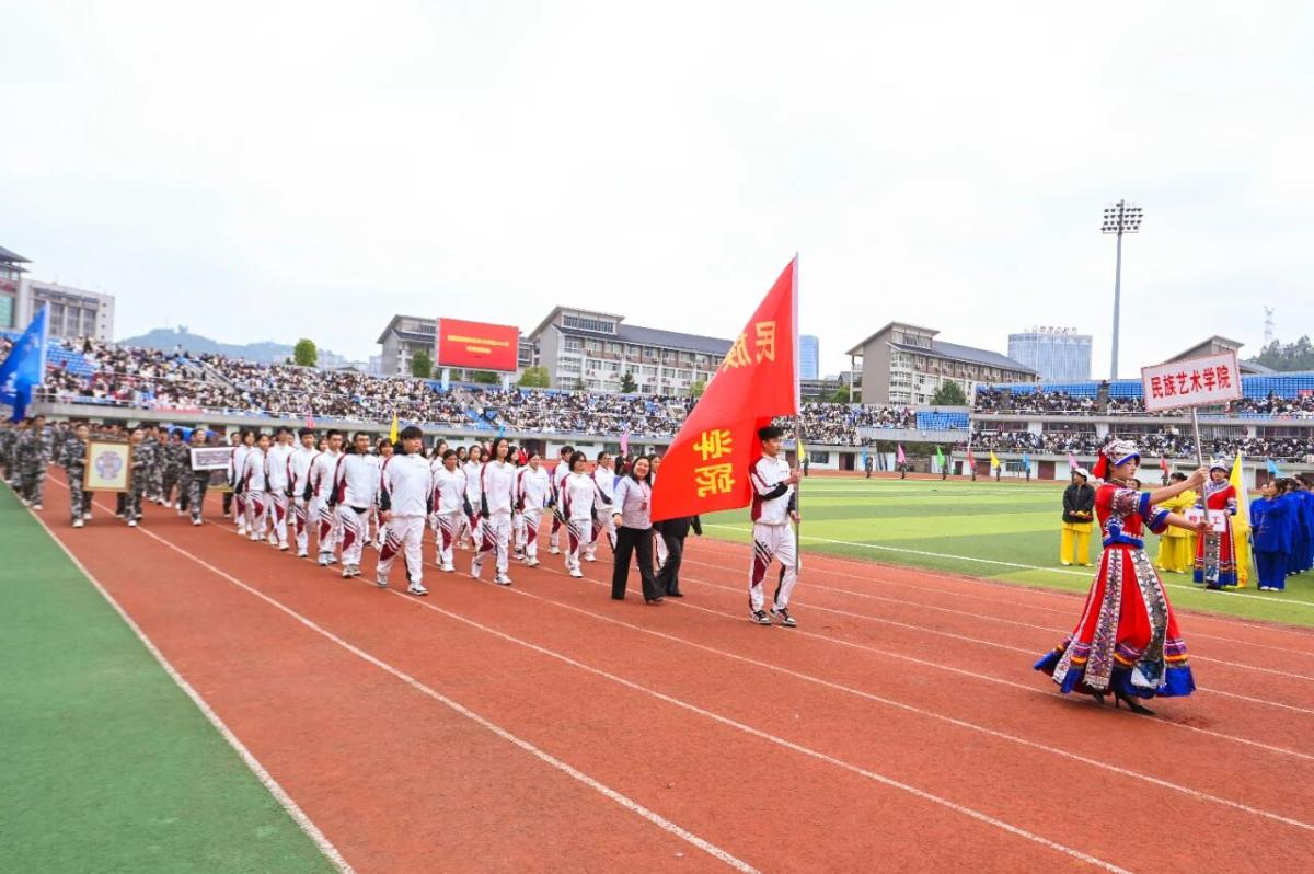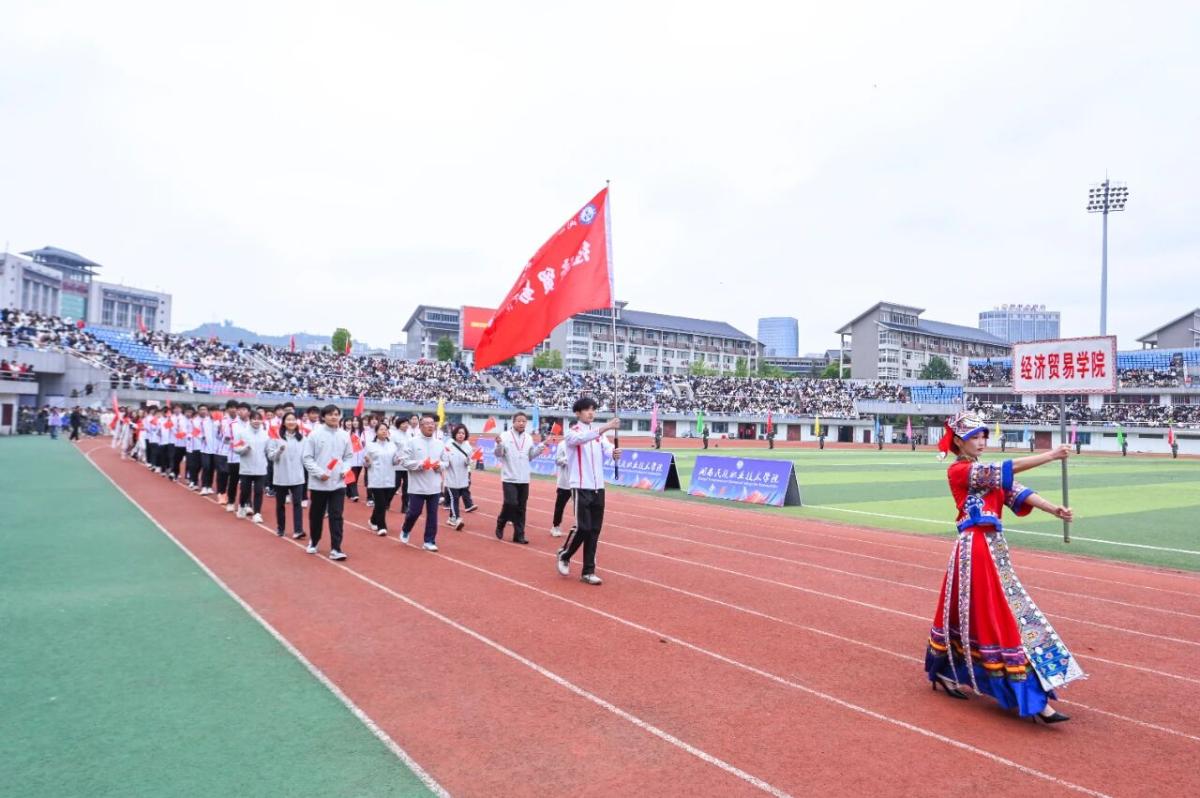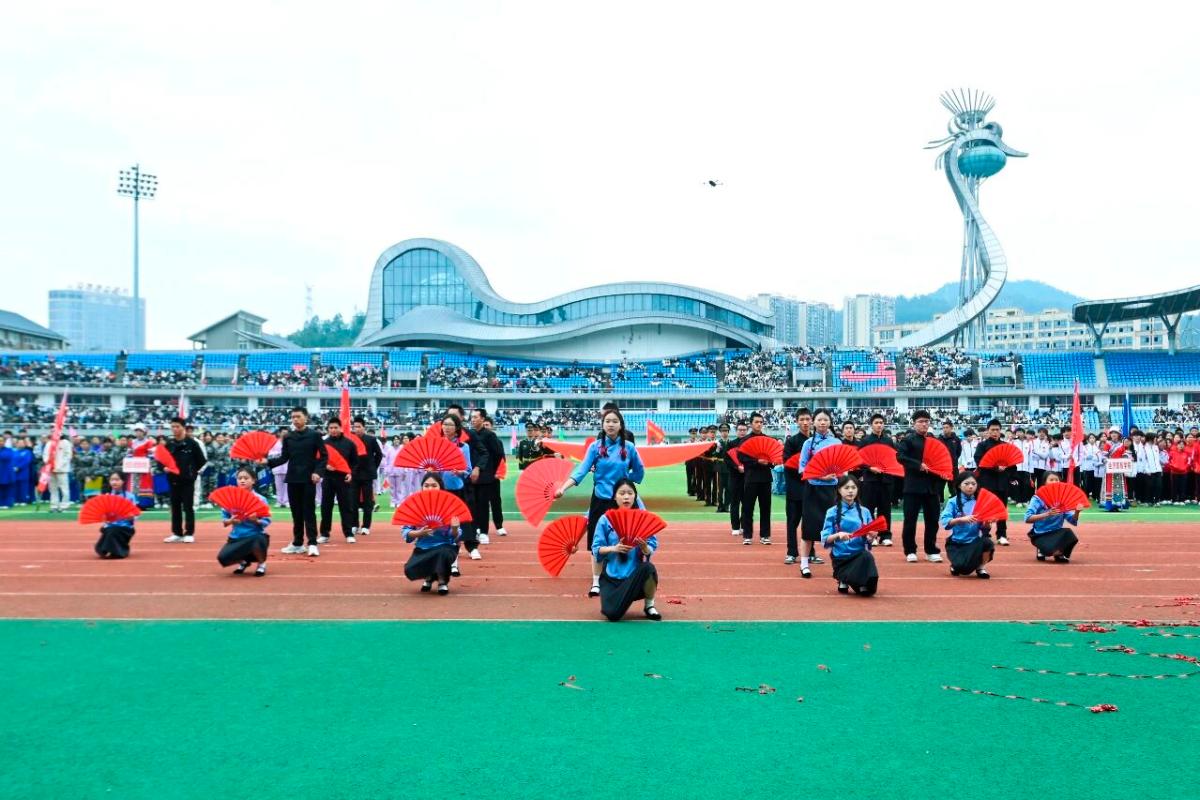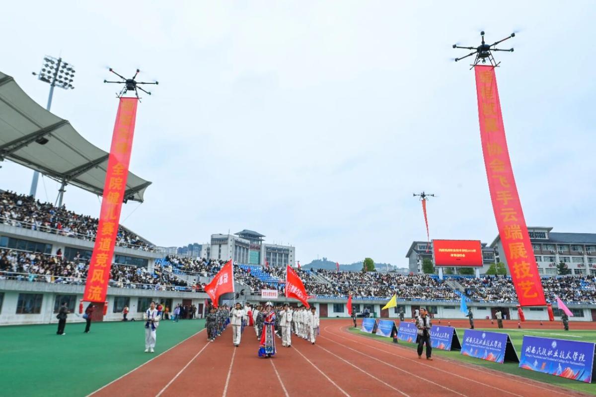 开幕式在公共课部、机电工程学院等联合呈献的舞龙舞狮表演中拉开帷幕。本次表演在传统舞龙舞狮的基础上,创新融入了湘西本土“钢火烧龙”等民俗元素,展现了中华民族传统文化中的湘西元素,赢得全场阵阵喝彩。国旗护卫队步伐整齐、神情坚定,护卫五星红旗庄严入场,学校纠察队组成的彩旗方阵与裁判员代表队紧随其后步入会场。八个二级学院结合各自专业特色,以富有创意的入场形式和精彩表演,将现场气氛推向高潮,充分展现出各学院的蓬勃朝气与育人成果。教职工代表队带来的太极表演,则生动诠释了师生全民健身、终身运动的良好风尚。