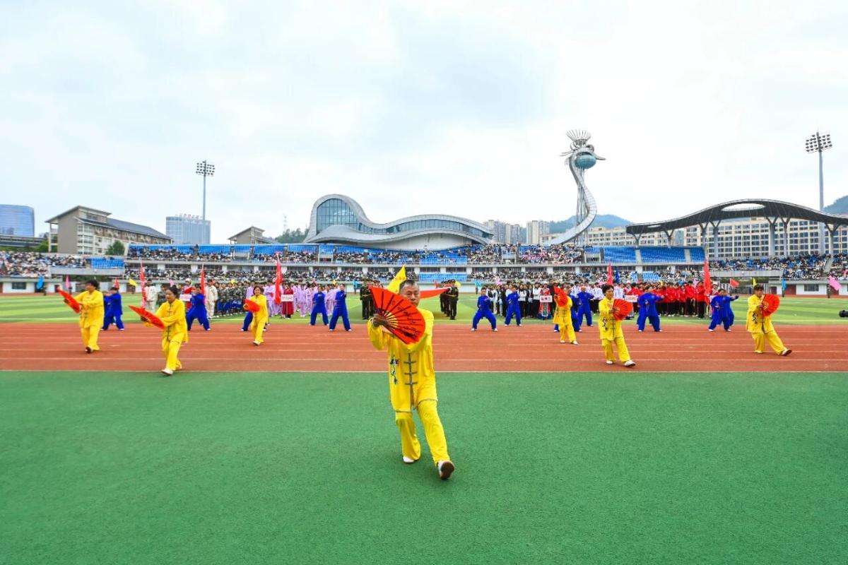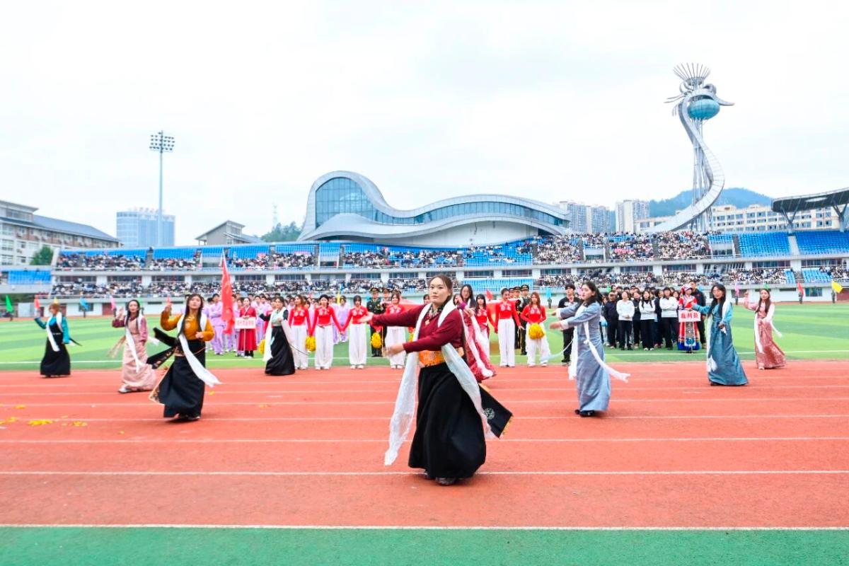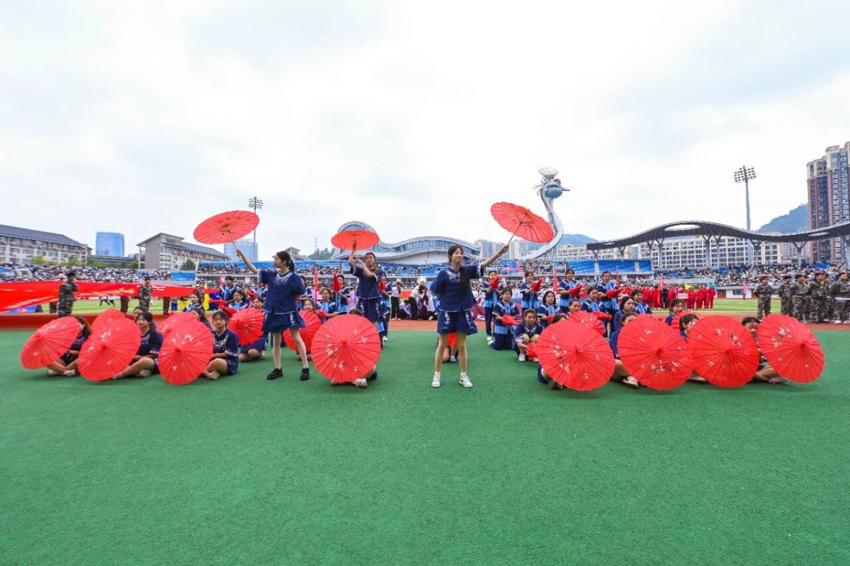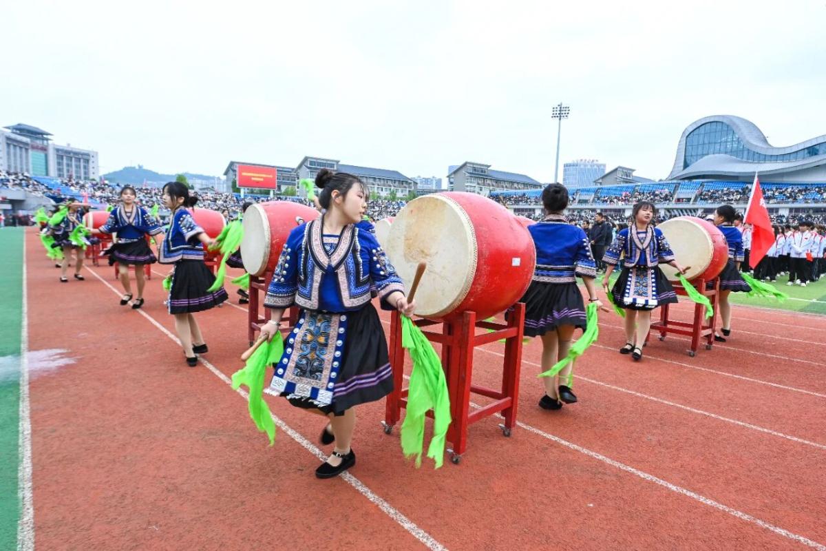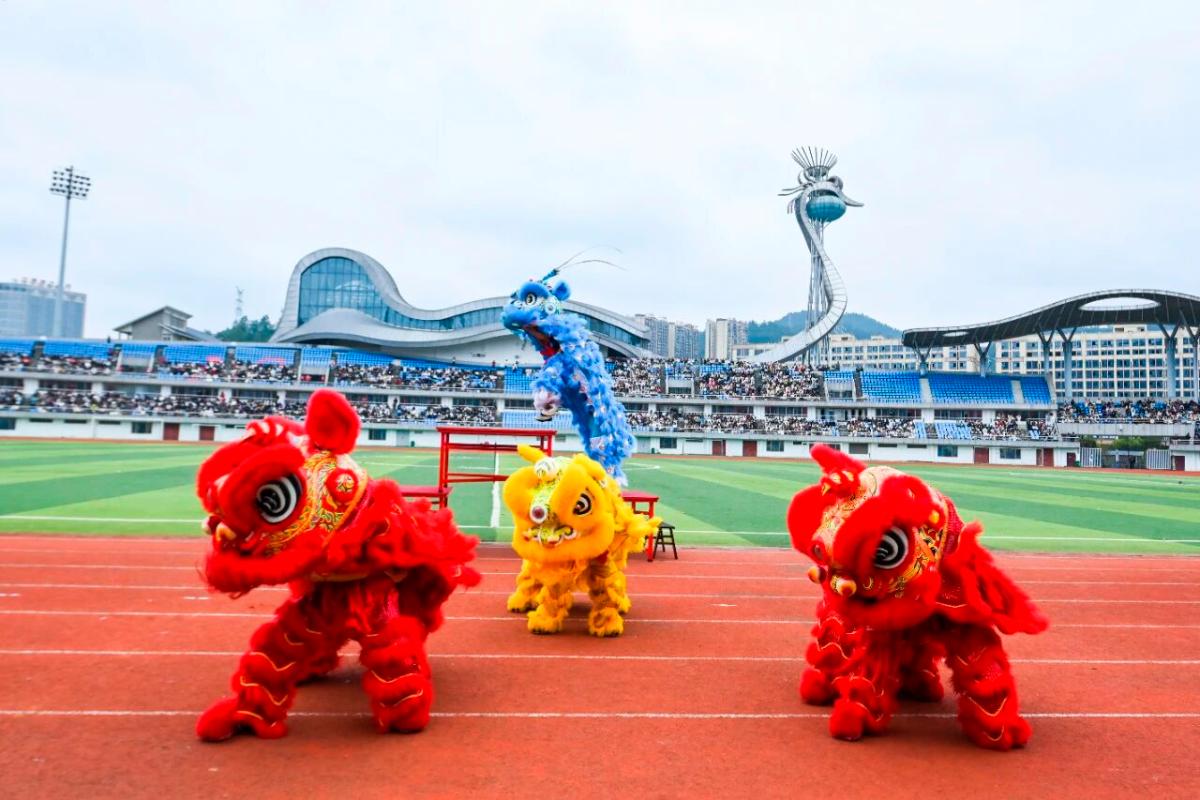 开幕式在公共课部、机电工程学院等联合呈献的舞龙舞狮表演中拉开帷幕。本次表演在传统舞龙舞狮的基础上,创新融入了湘西本土“钢火烧龙”等民俗元素,展现了中华民族传统文化中的湘西元素,赢得全场阵阵喝彩。国旗护卫队步伐整齐、神情坚定,护卫五星红旗庄严入场,学校纠察队组成的彩旗方阵与裁判员代表队紧随其后步入会场。八个二级学院结合各自专业特色,以富有创意的入场形式和精彩表演,将现场气氛推向高潮,充分展现出各学院的蓬勃朝气与育人成果。教职工代表队带来的太极表演,则生动诠释了师生全民健身、终身运动的良好风尚。
