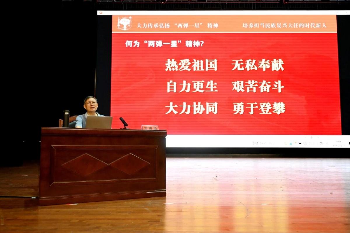 讲座中,王定放将军围绕“铭记卓越历史功绩”“铭记功勋英雄群体”和“铭记伟大时代精神”三个维度,系统阐释了“两弹一星”精神的核心内涵——“热爱祖国、无私奉献、自力更生、艰苦奋斗、大力协同、勇于攀登”。他结合真实历史事件和感人故事,生动讲述了“两弹一星”伟业背后的艰辛与辉煌,深刻分析了这一伟大工程的历史意义与时代价值。