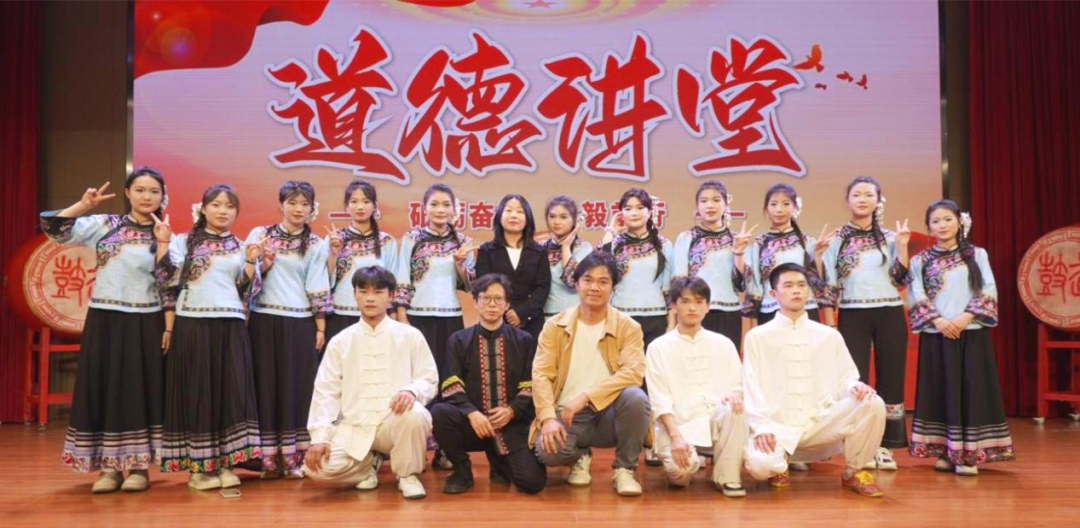 活动当日,道德讲堂现场座无虚席,各级领导与代表齐聚一堂。随着灯光的聚焦,八合鼓武队员们身着传统服饰,精神抖擞地步入舞台中央。队员们身姿矫健,动作整齐划一,每一次跃起、每一次挥臂,都将武术的刚健有力与鼓乐的节奏韵律完美融合,深刻体现了湘西地区丰富的民族文化底蕴,充分展现出湘西职院学子们的青春风采和对传统文化的深刻理解。